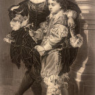 Two elegantly dressed fashion dolls stand posed in front of a softly lit backdrop. One wears a dark, ruffled outfit with a large hat, while the other is in a light-toned, pleated ensemble.