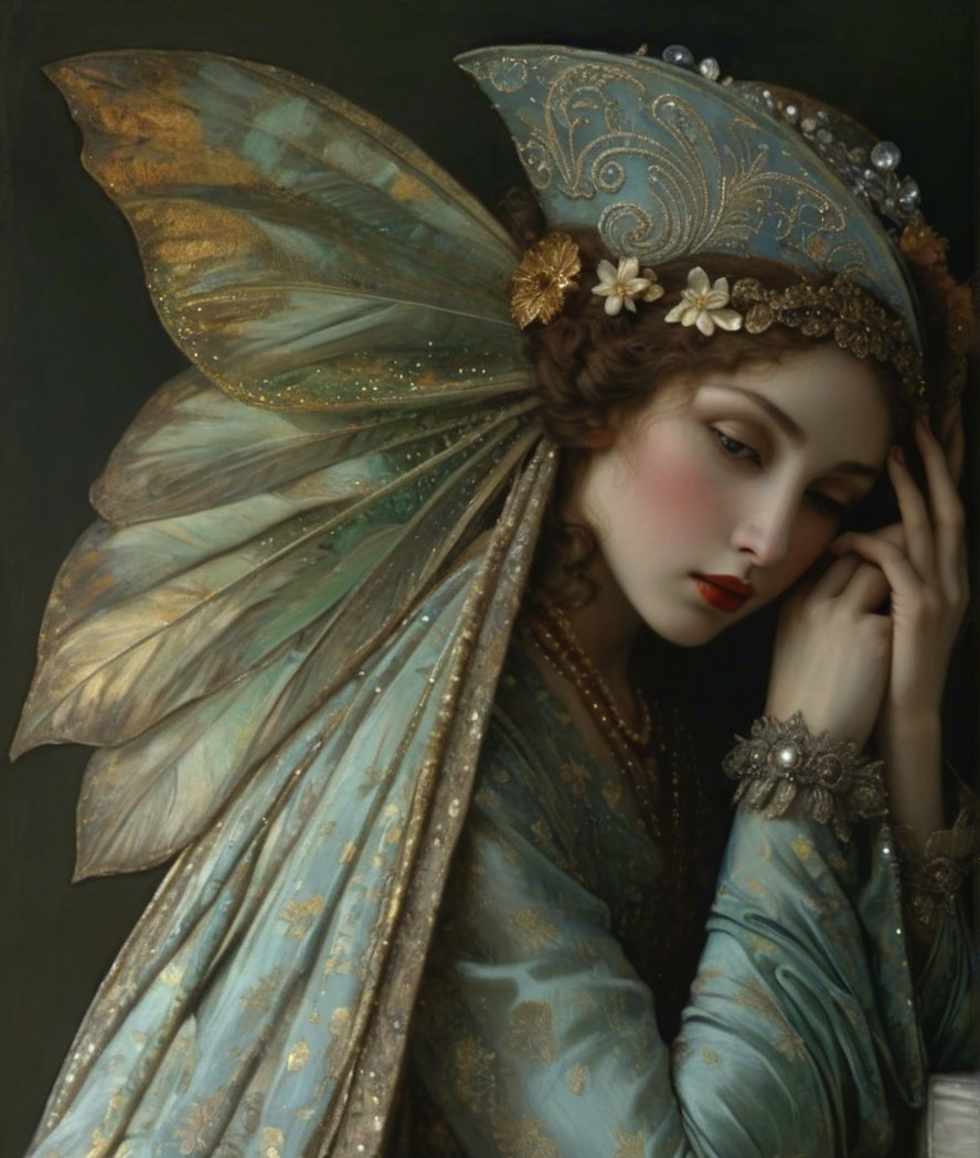 A graceful figure adorned in an intricately designed turquoise gown, featuring delicate butterfly wings. She wears elegant jewelry and displays a serene expression, evoking a sense of enchantment.