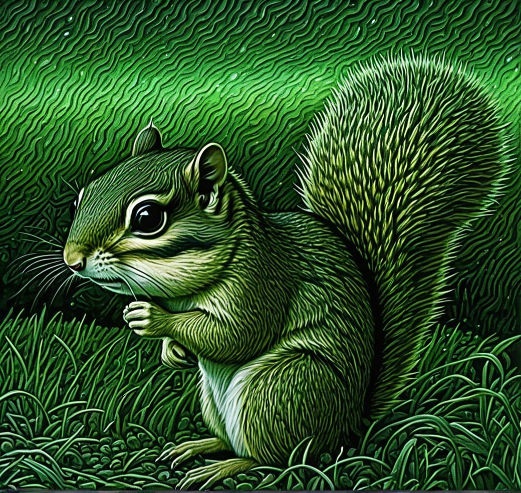 A detailed illustration of a chipmunk stands on its hind legs, gripping its paws together. It has distinctive stripes on its back and is surrounded by lush green grass.