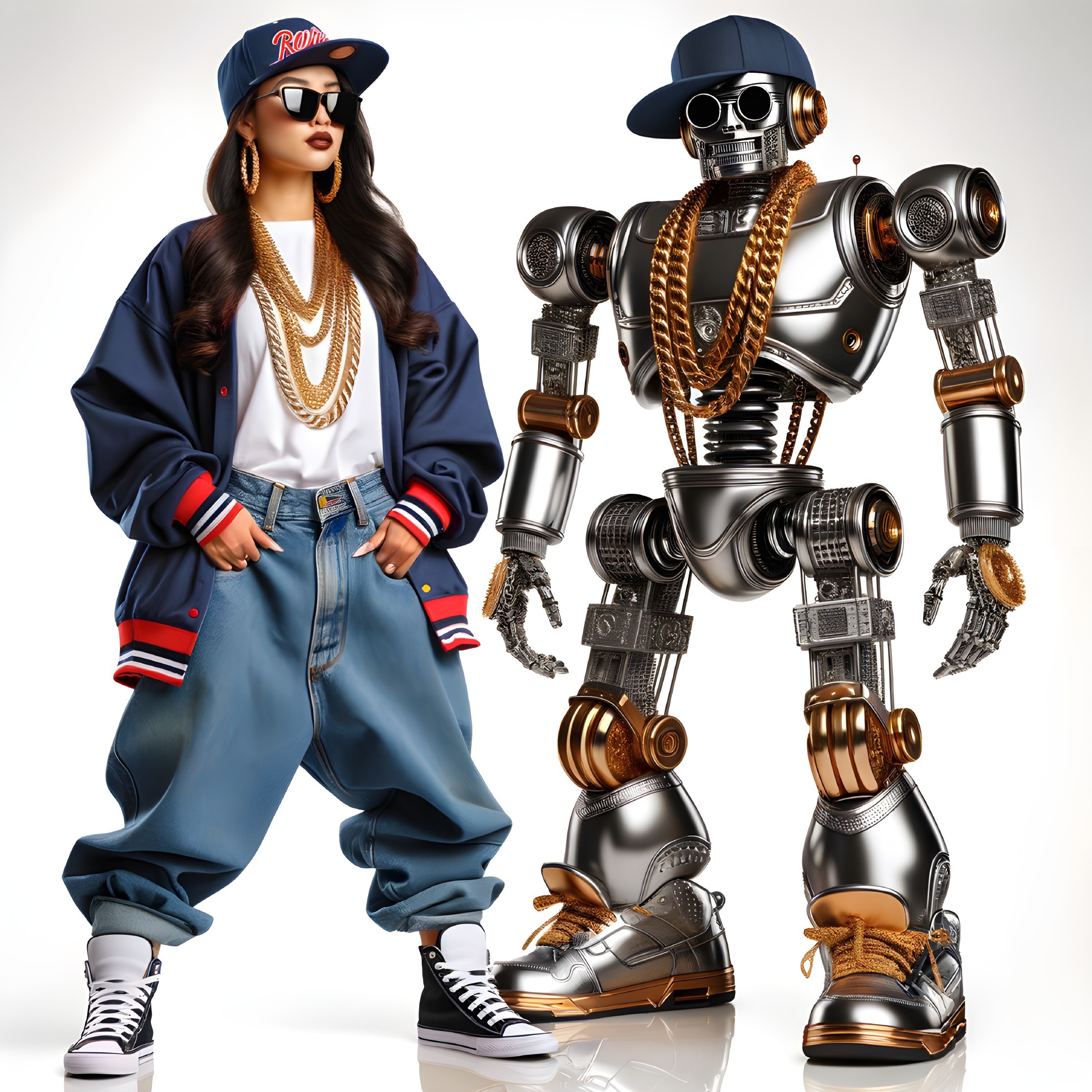 A stylish woman and a robot both wearing hip-hop fashion with gold chains, caps, and sneakers pose confidently.