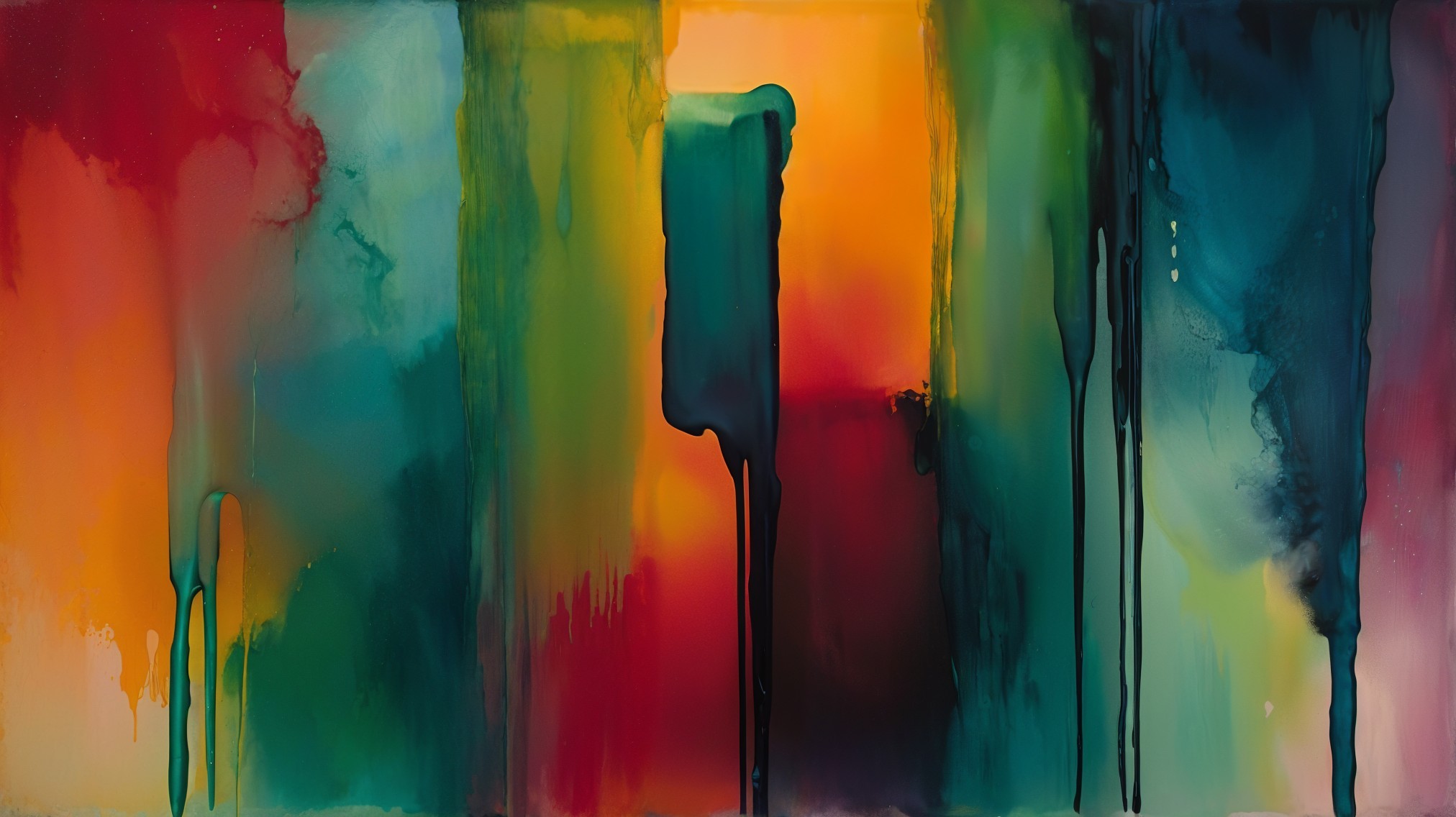 A vibrant abstract painting featuring vertical stripes of rich colors, including deep greens, warm oranges, and golden yellows, with subtle drips adding depth and texture.