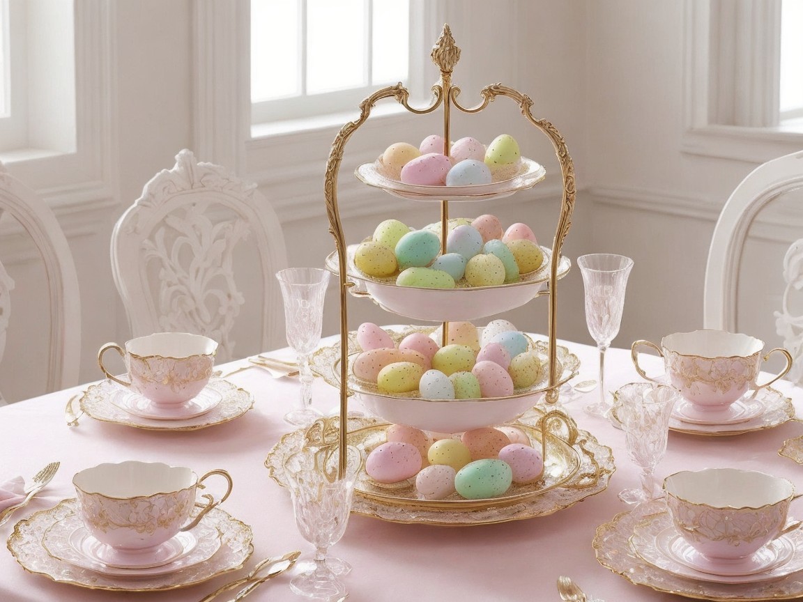 A beautifully set table features an elegant three-tier stand filled with pastel-colored Easter eggs. Delicate china teacups and plates, adorned with gold accents, enhance the festive ambiance.