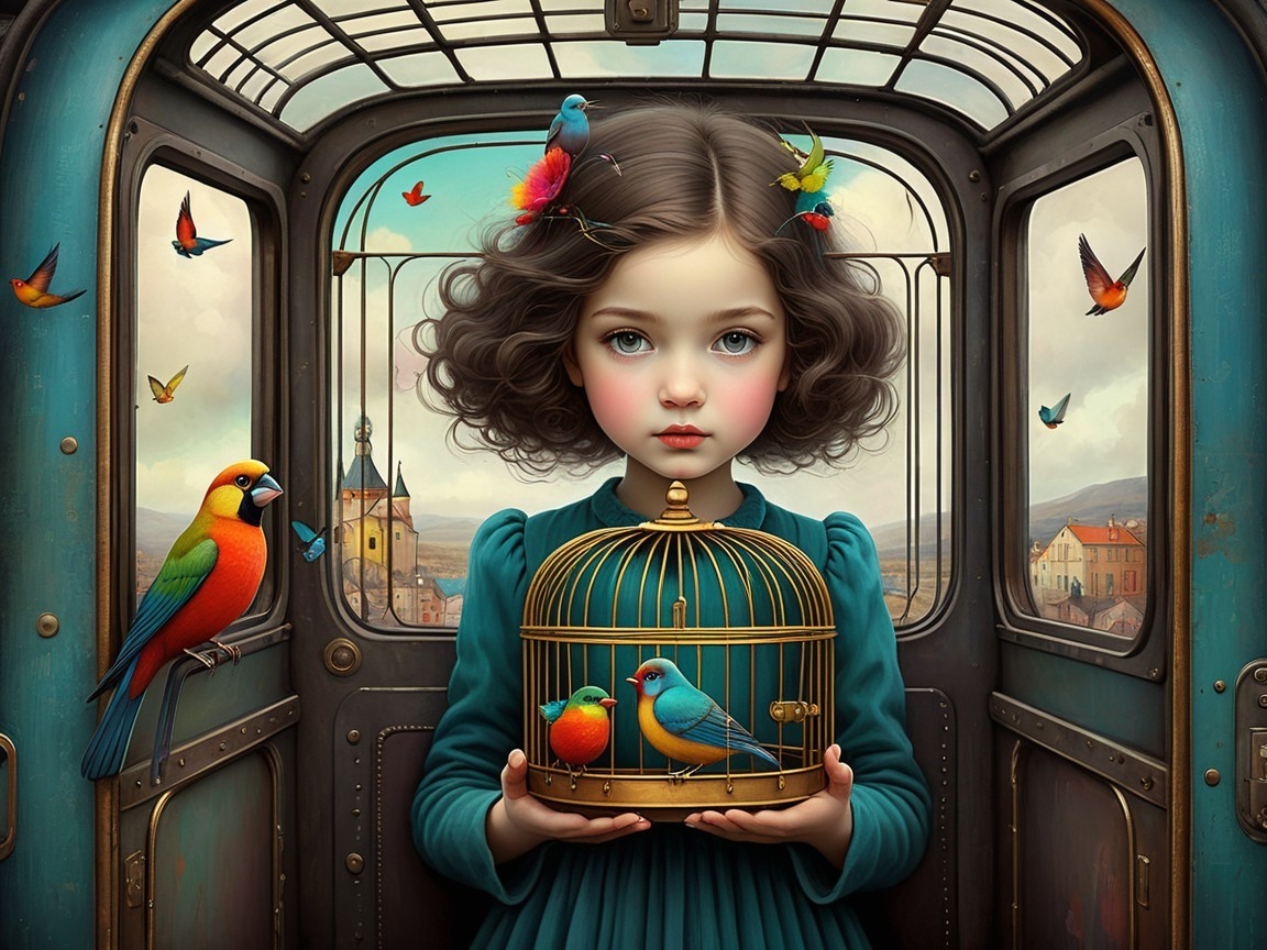 A whimsical scene unfolds on a train, featuring a cute girl alongside a vibrant bird in a cage. The artwork blends surrealism and magical realism with a matte background, creating a charming, dreamlike atmosphere.