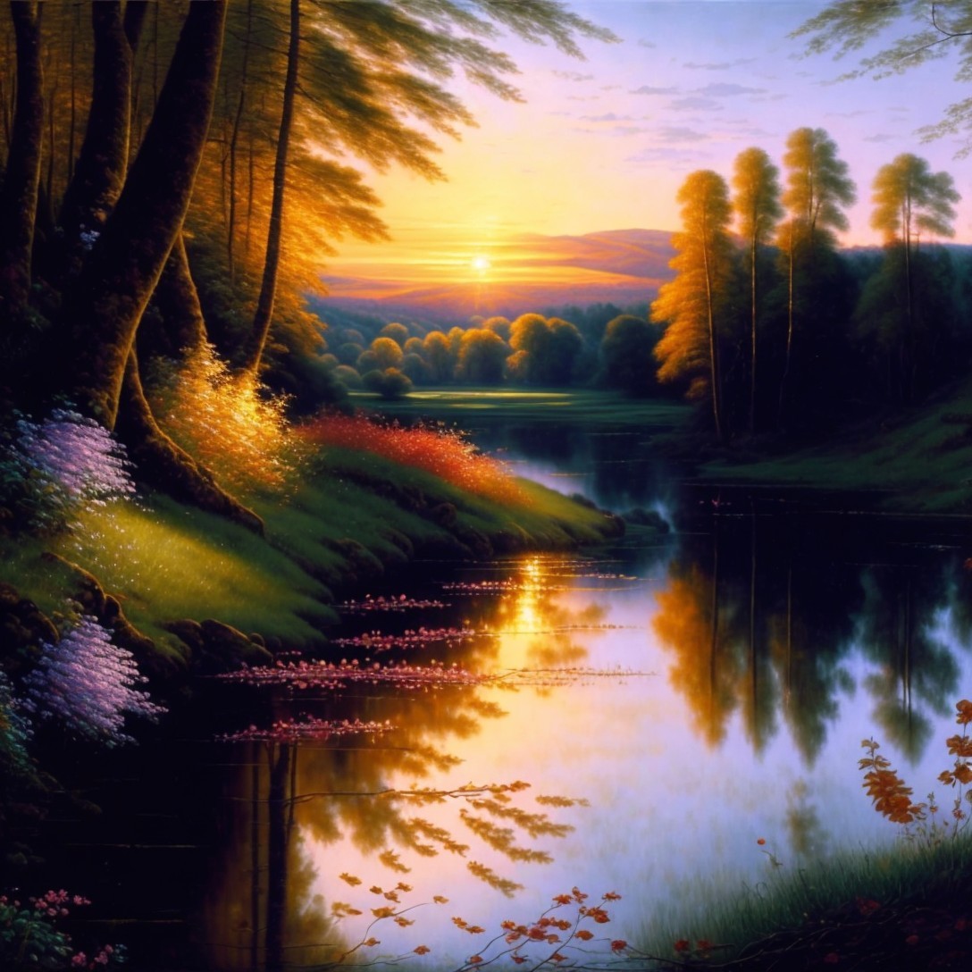Prompt: "FULL PAGE image, no angled image, no mat, no frame, 3d oil, deer grazing by river, reflections in river, breathtaking sunset, large-leaf lacy plants, night blooming flowers, royal colors, distant hills and forests, intricate, satiny, high quality, shimmering, by William Turner, with elements of Gustav Klimt style"
