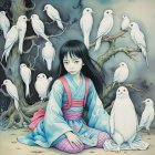 A serene girl in a colorful kimono sits surrounded by white birds amidst blossoming trees. The artwork features a blend of vibrant hues and gentle expressions, evoking tranquility and harmony.