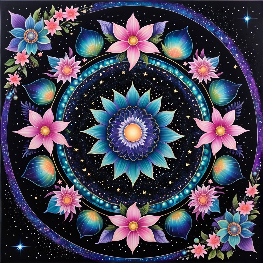 A vibrant mandala design featuring an array of colorful flowers in shades of blue, pink, and purple, set against a deep black background.