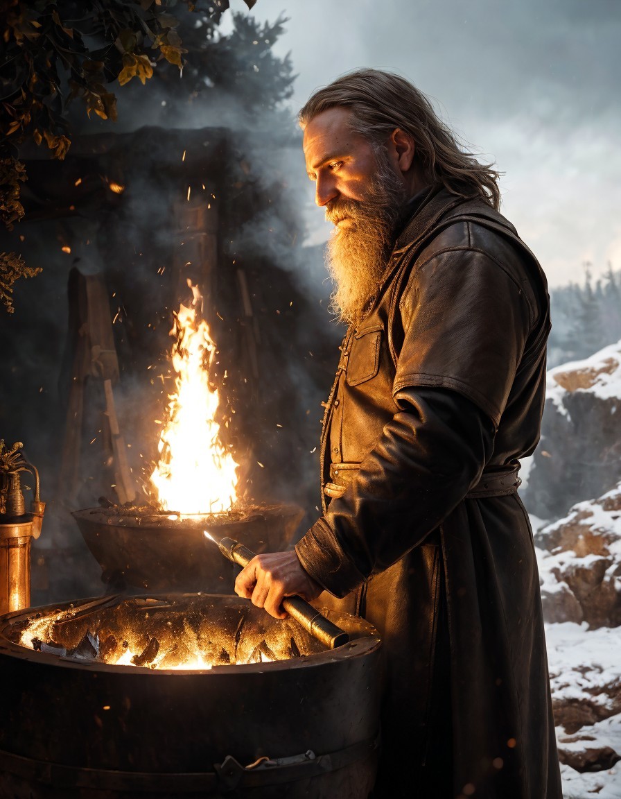 A bearded man in medieval attire tends to a fire in a snowy outdoor setting, evoking a rugged, historical atmosphere.