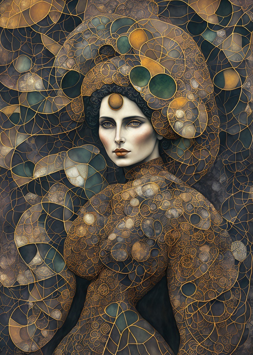 Beautiful woman with a beehive hairdo, portrait in ochre, patina of ancient stone with moss, art brut, moody, somber, desaturated colors, in the style of Paul Klee, Arthur Rackham