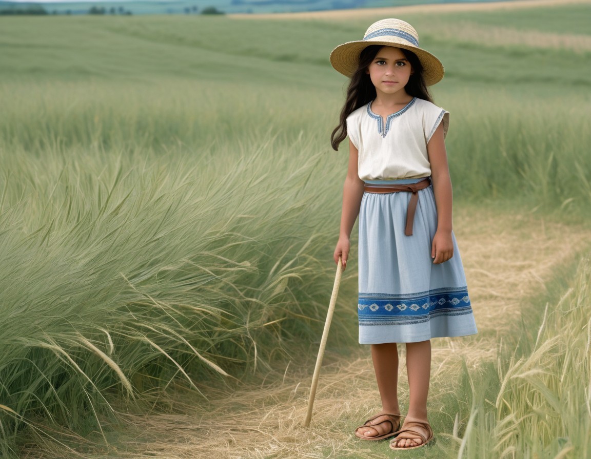 A scene from the Bronze Age. A full-body representation. A girl (aged 7) with olive-coloured skin and long, dark hair. She is dressed in a light-coloured, sleeveless tunic with blue embroidery, a grey skirt and a blue hip sash. She is wearing a straw hat and leather sandals. In the background is a field of grain at the edge of a forest.