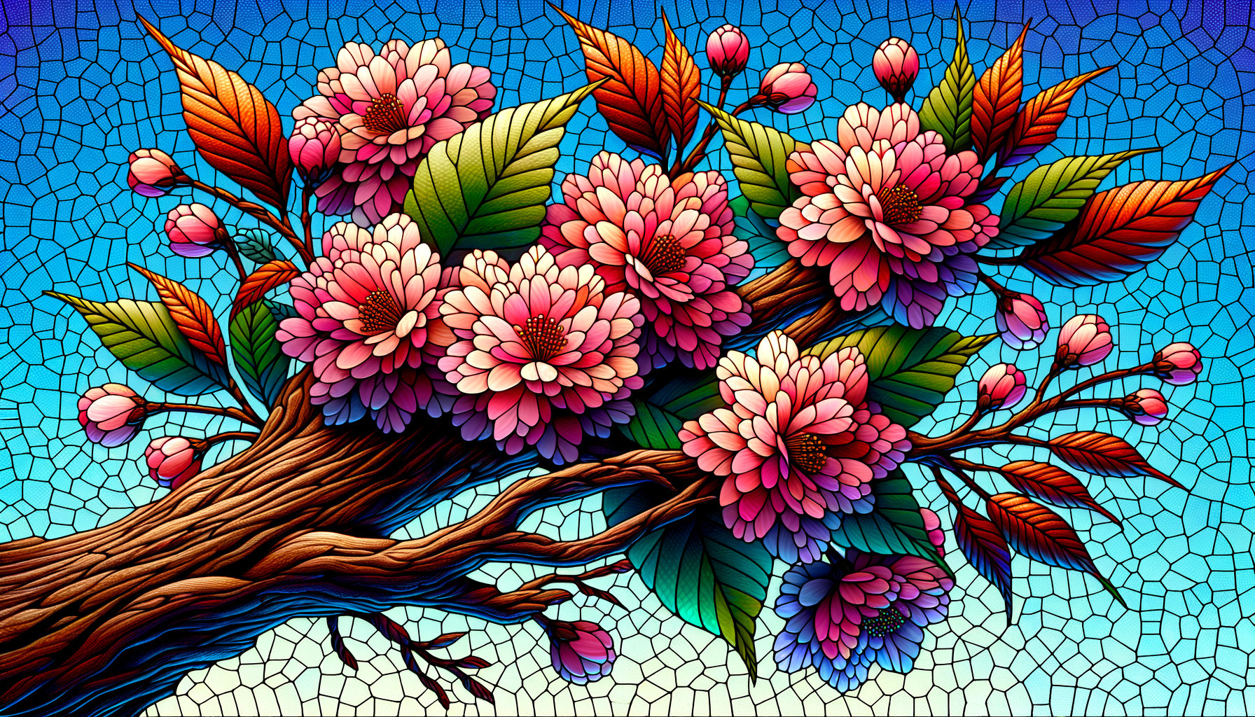 Stylized mosaic artwork featuring vibrant flowers in pink hues with interwoven branches against a blue tessellated background.