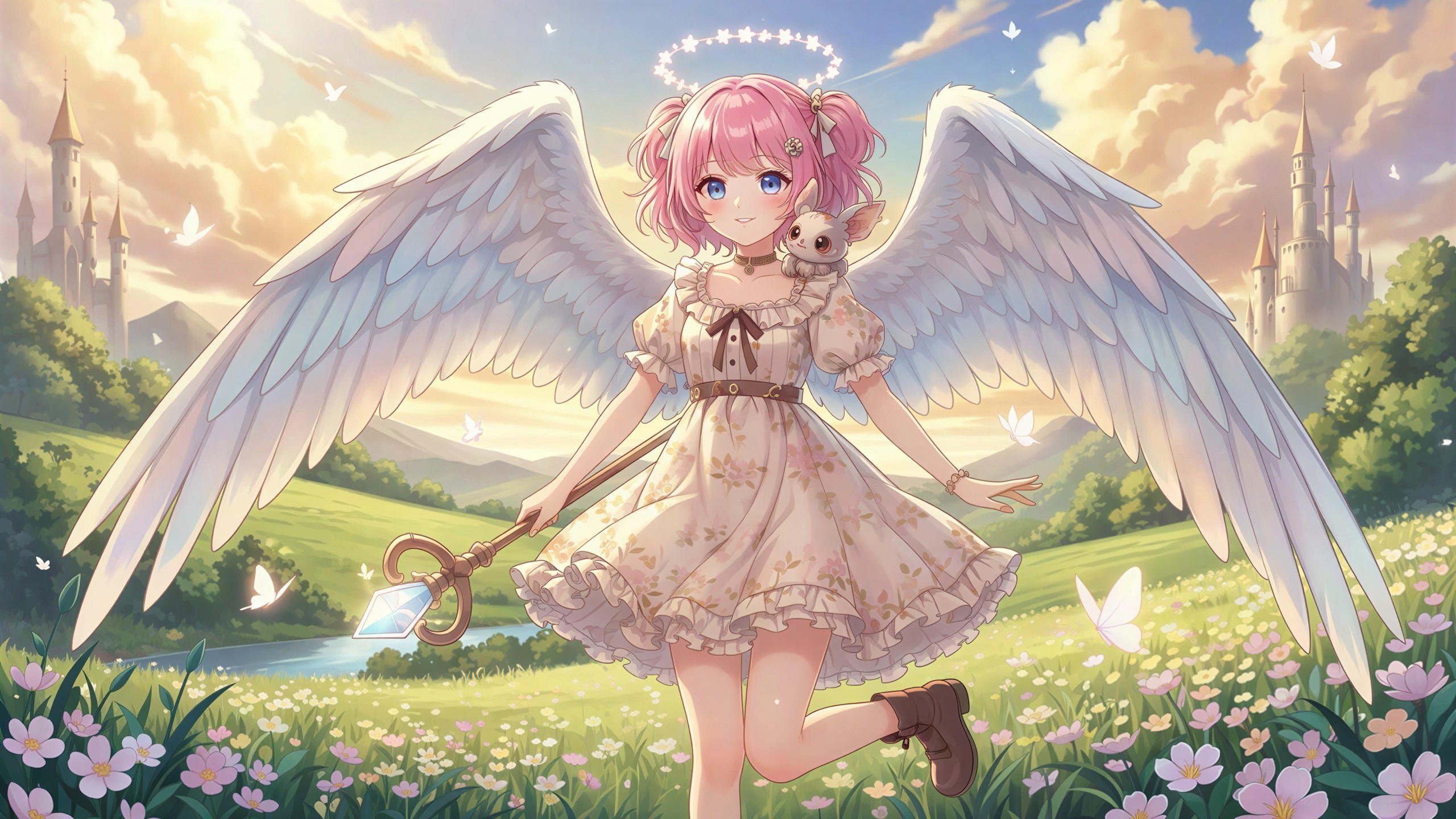 A charming anime girl with delicate, feathered wings radiates a sense of whimsy and enchantment. Her bright eyes sparkle with curiosity, and her playful demeanor adds to her captivating charm.