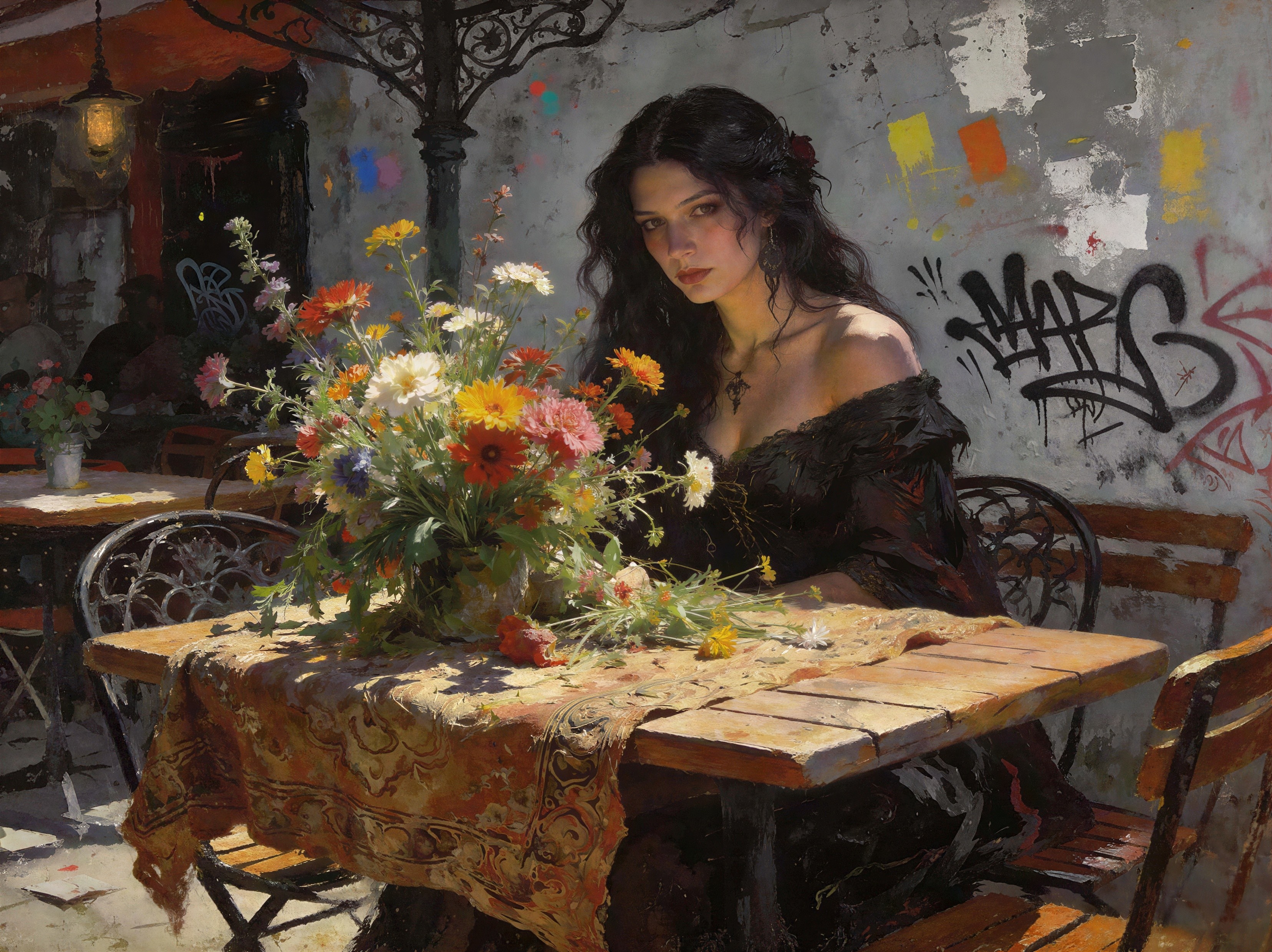 A widow sits at a café table, surrounded by an explosion of color and light. Life goes on around her — in flowers, sunlight — yet her gaze holds the traces of loss, where memory is stronger than joy, and waiting becomes a habit of pain.