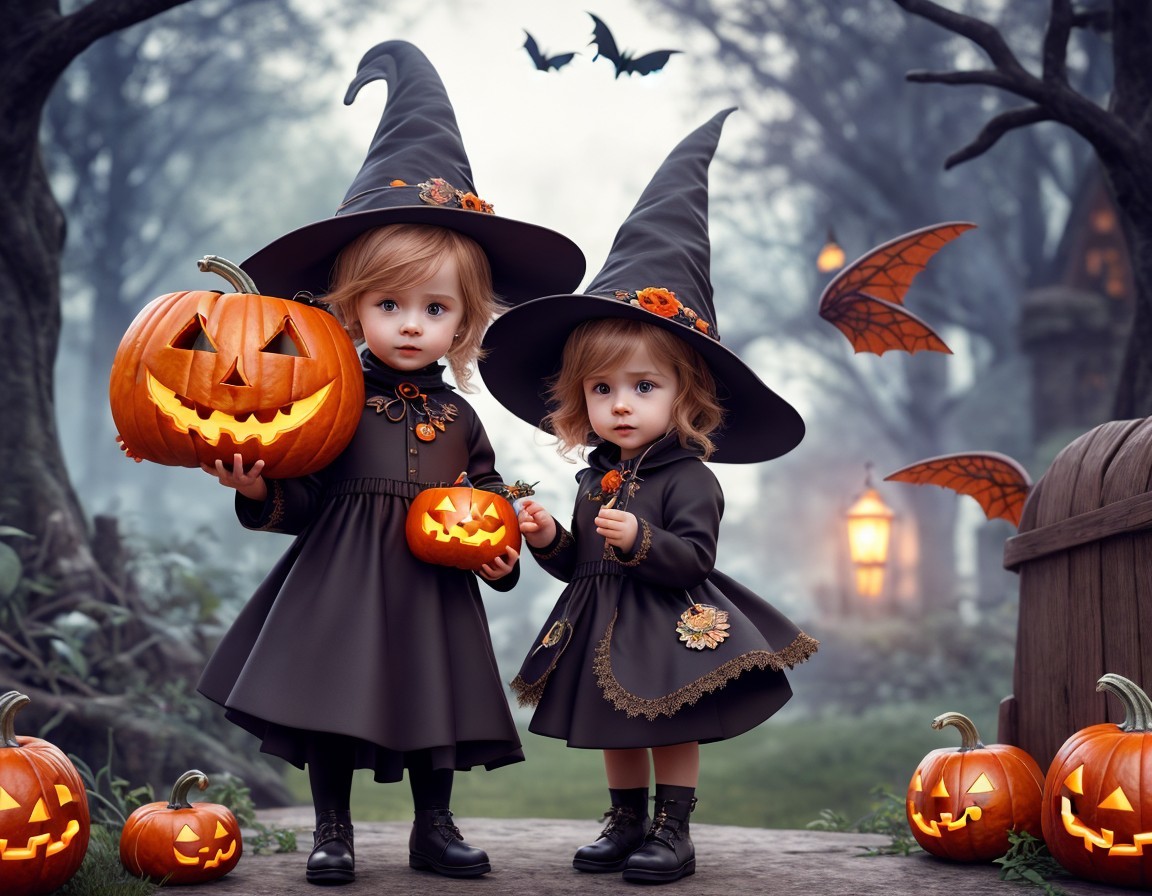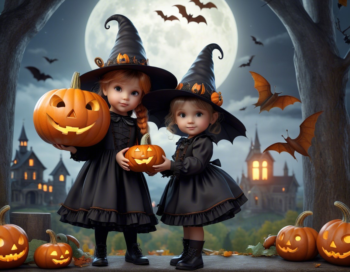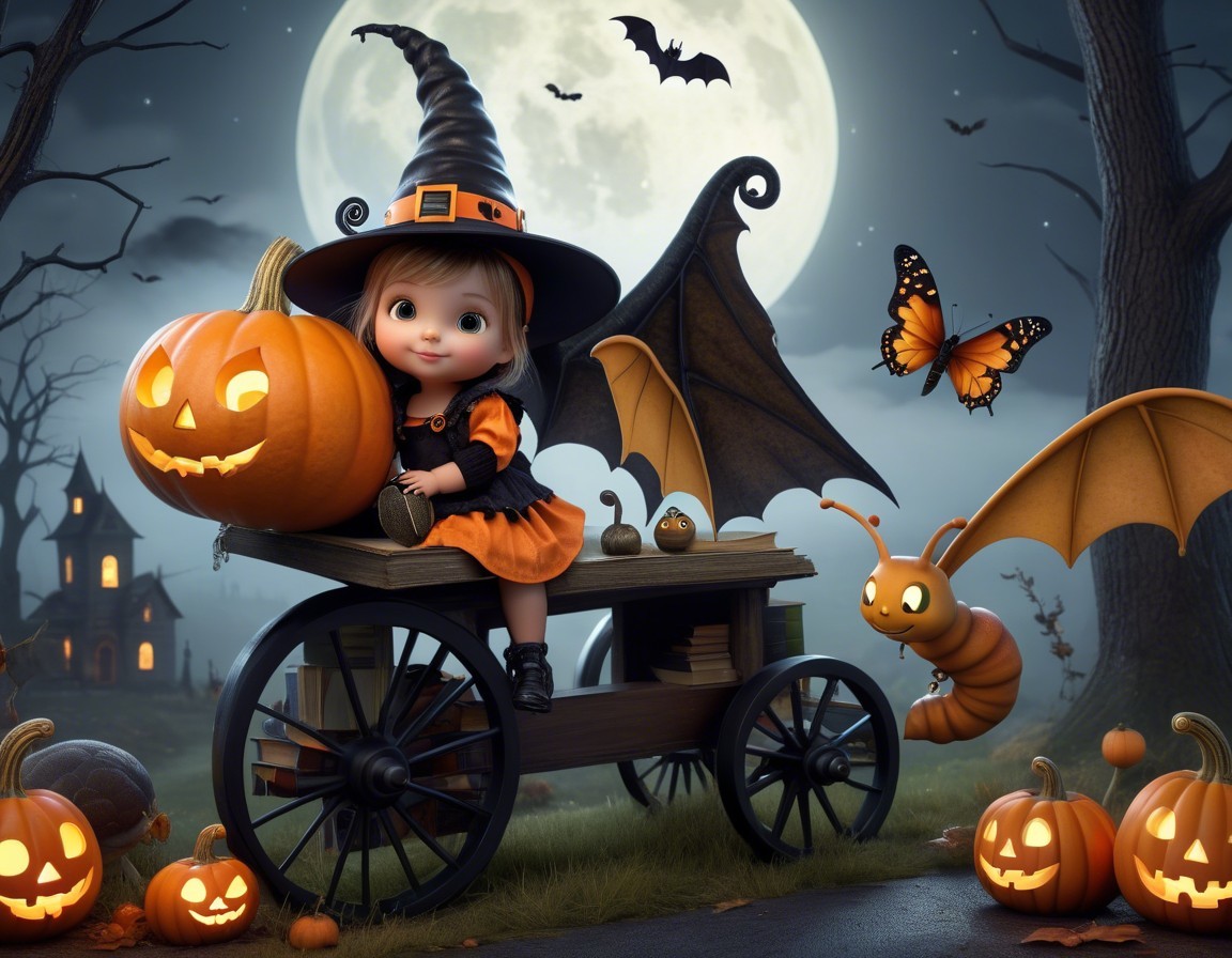 A cheerful child in a witch hat rides a book cart, holding a carved pumpkin. Bats and butterflies flutter nearby under a full moon, surrounded by glowing jack-o'-lanterns. Art is created by constance lowery.