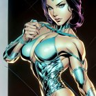 A confident character in a futuristic, metallic bodysuit strikes a powerful pose. Her striking features and intense gaze suggest strength and determination, set against a sleek background.