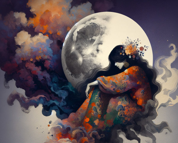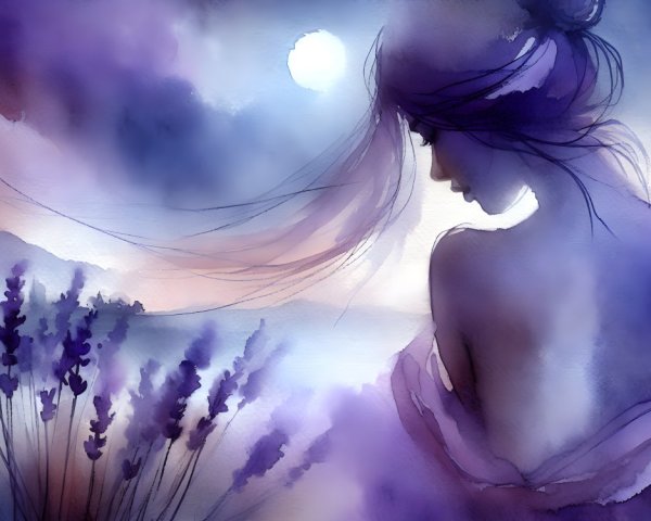 A serene scene featuring a young woman in a white dress, sitting at a table adorned with flowers and fruit, bathed in warm, golden light amidst lush greenery.
