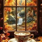 A charming scene framed by an old window showcases a delicate tea cup on a rustic table, surrounded by vibrant autumn leaves, overlooking a serene waterfall and colorful fall foliage outside.