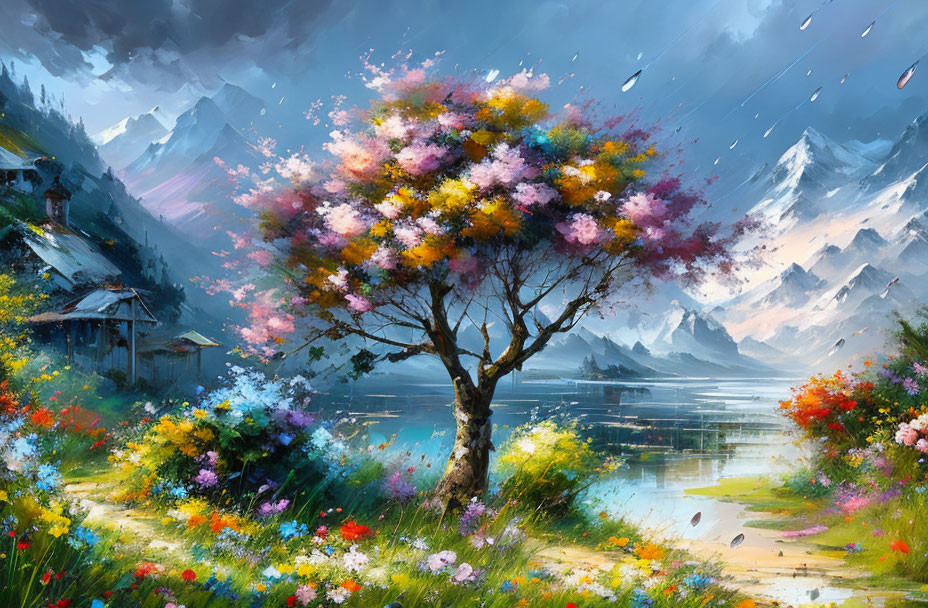 Colorful fantasy landscape with tree, cottage, boat, and oversized raindrops