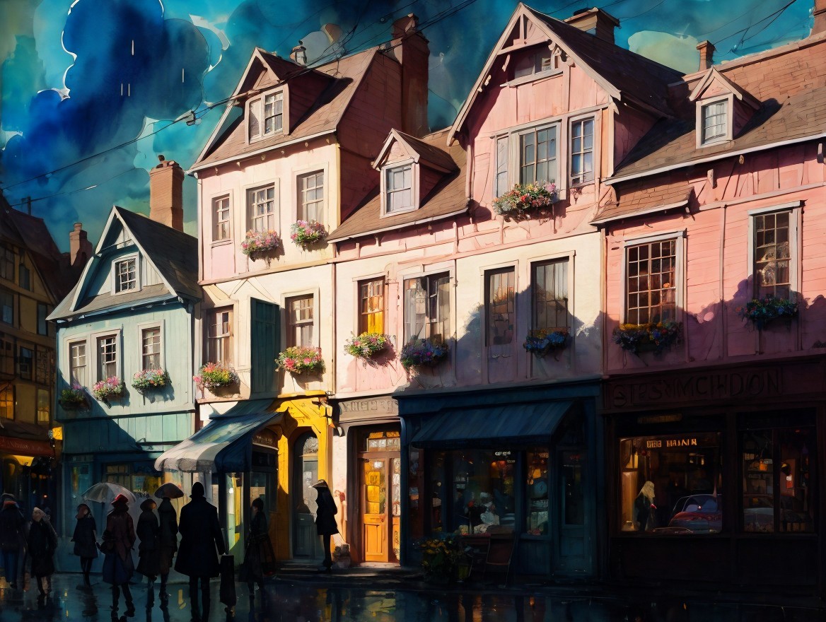 Prompt: Illustration described with circular lines drawings of street landscape in watercolor sunshine sunset strong clods , people, cars, rain, half timbered houses colorful of Jeremy Mann, Dee Nickerson and style of Louis Jover