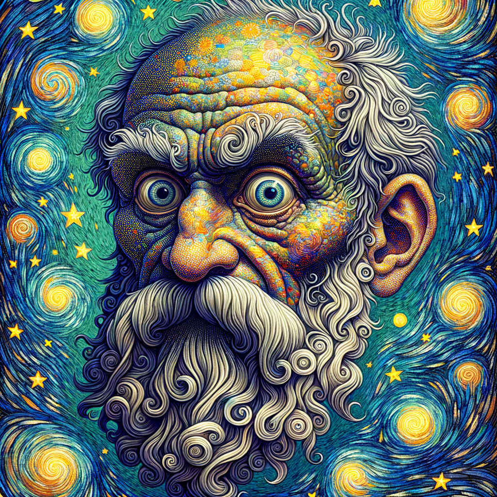 A stylized portrait of a man with a white beard against a swirling blue and starry background reminiscent of Van Gogh's "Starry Night."Bearded Wonder in Starry Night