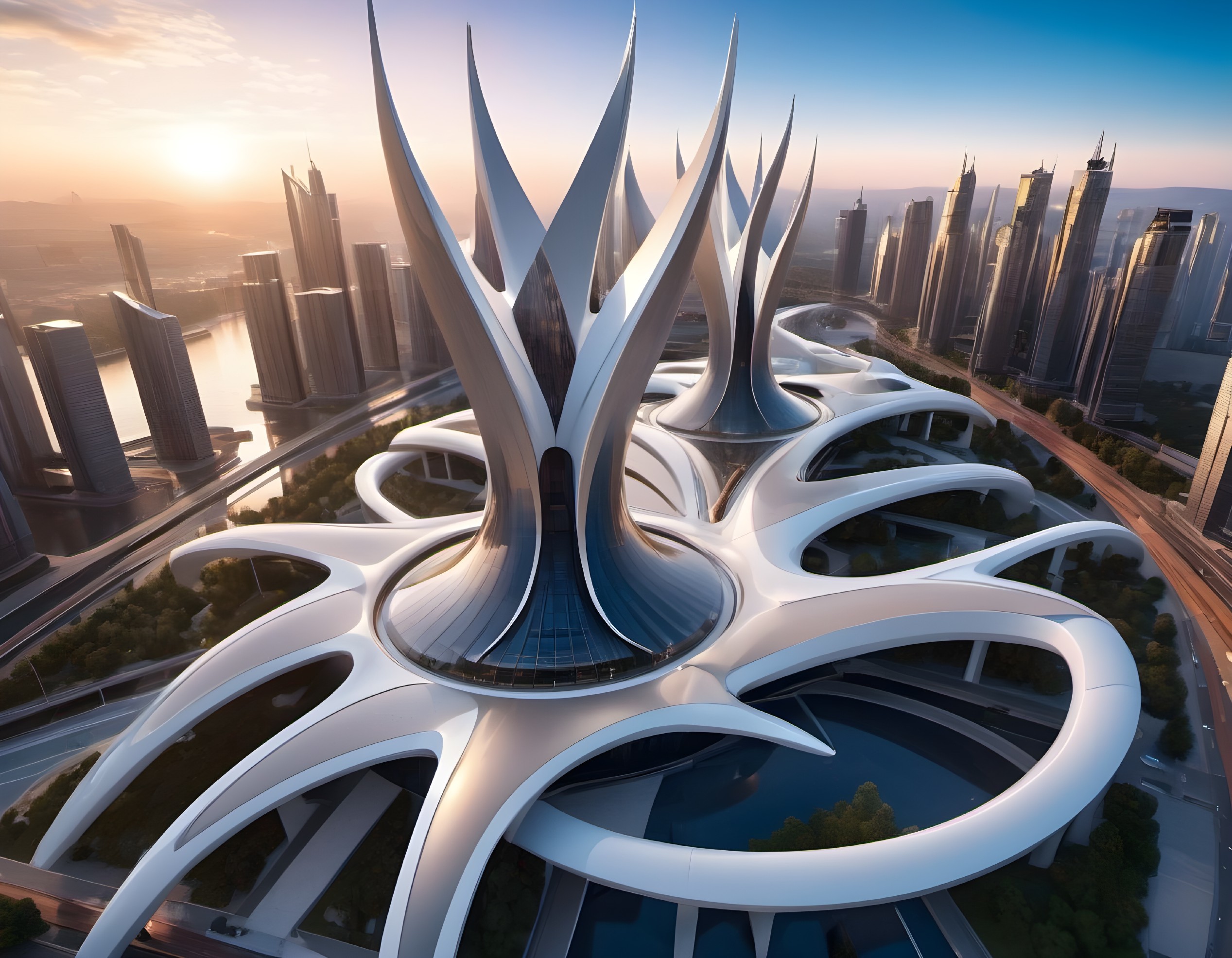 Futuristic building with spiky design amidst a cityscape at sunrise.