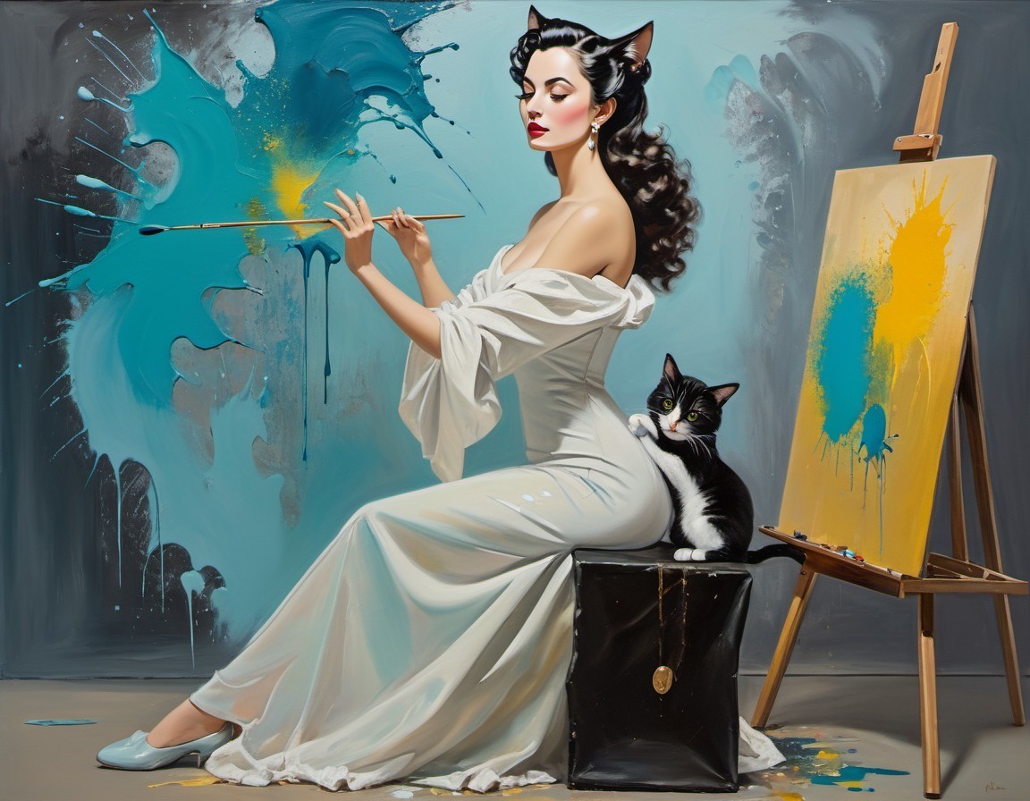 Prompt: "pastel colors, splash paint, paint drift, palette knife painting, easel, canvas, cat, beautiful woman, elegant pose, brush strokes, messy.