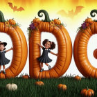 Children in Witch Costumes in Autumn Pumpkin Scene