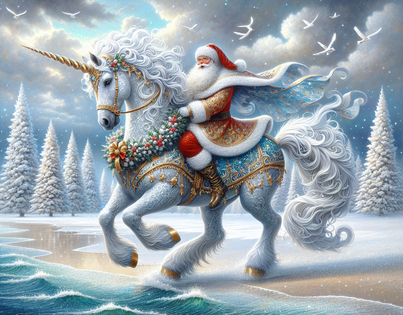 A whimsical digital artwork depicts a magical Christmas unicorn galloping on a winter-themed beach. The unicorn, adorned with a festive crown, carries Santa in a stylish blue and gold suit amidst snowy trees and gentle snowflakes.