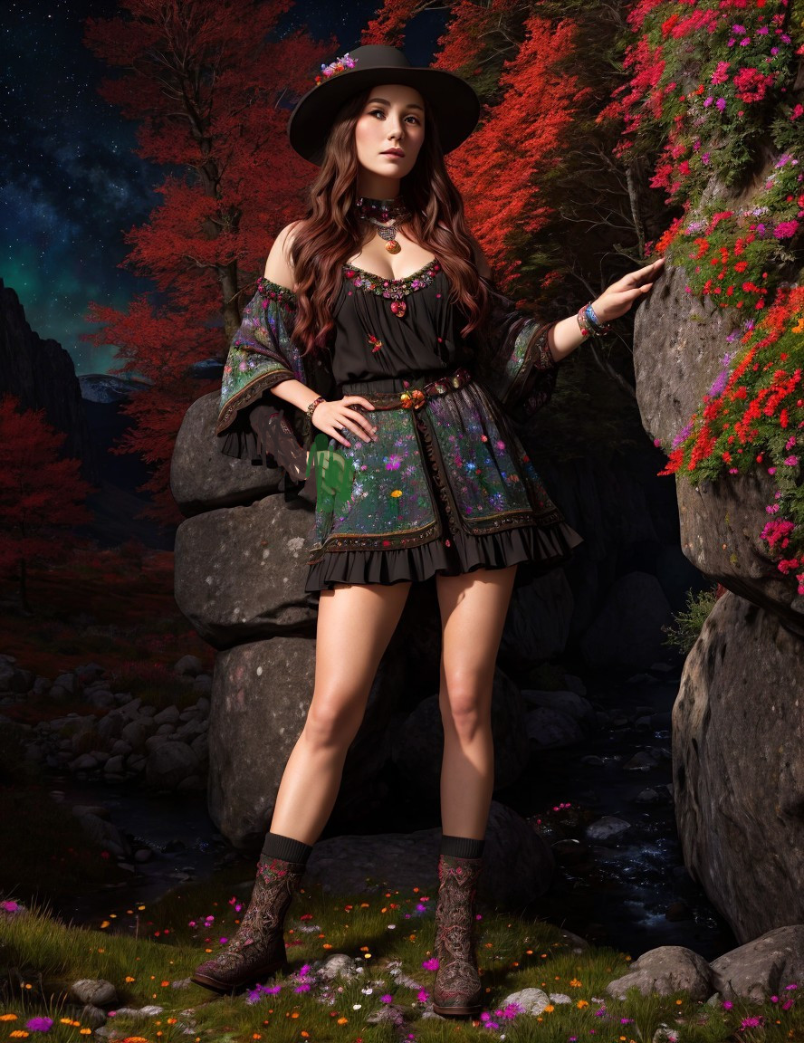 A woman stands confidently in a colorful, bohemian dress with a flowing silhouette. She wears a wide-brimmed hat, knee-high boots, and is surrounded by a vibrant, surreal landscape.