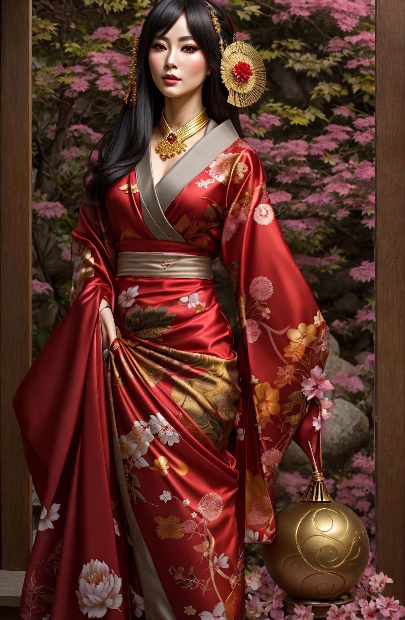 Prompt: Photorealistic, A photo of An elegant sexy beautiful woman Kabuki dancer in a Japanese garden, facial makeup, gold black peach green gray red and white, highly detailed silk kimono, very realistic photo, Karol Bak, Naoto Hattori, Ed Blinkey, Atey Ghailan, Greg Manchess, Antonio Moro