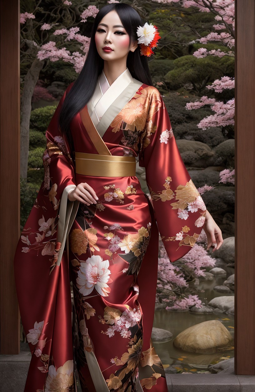 + Prompt:Photorealistic, A photo of An elegant sexy beautiful woman Kabuki dancer in a Japanese garden, facial makeup, gold black peach green gray red and white, highly detailed silk kimono, very realistic photo, Karol Bak, Naoto Hattori, Ed Blinkey, Atey Ghailan, Greg Manchess, Antonio Moro