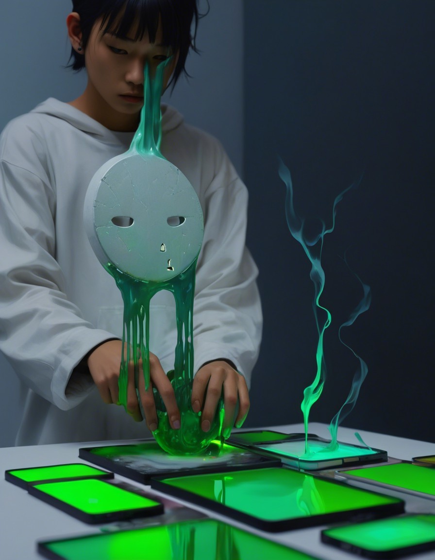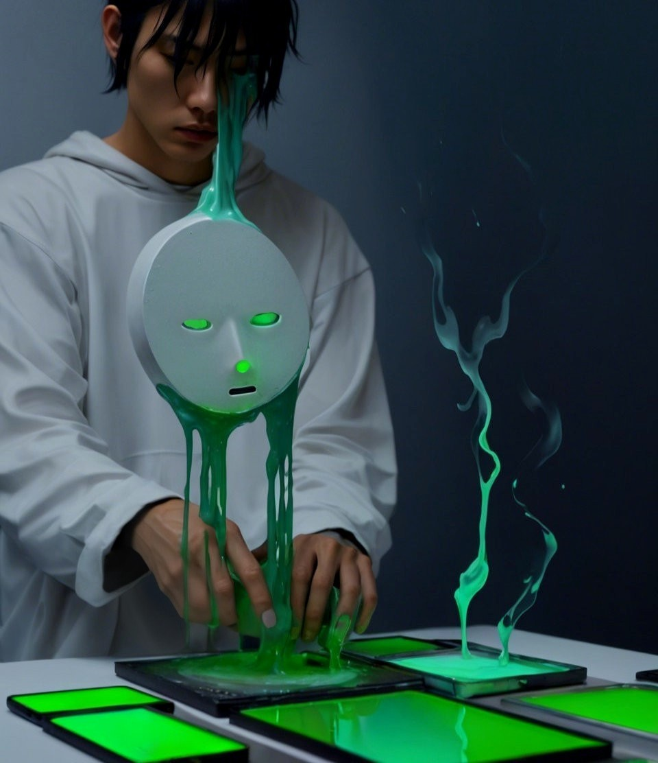 yin yang ghost, melting face, surrealism, cyberpunk, dark fantasy, neon, black magic, blank eyes, duality, split