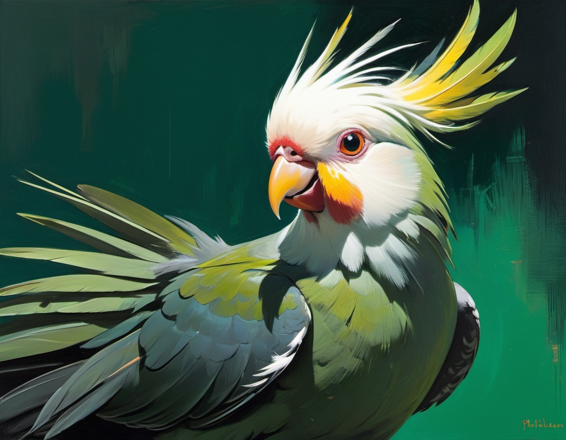 Prompt: "Colored chalk on dark green background, cockatiel, playful demeanor with wings closed, detailed feather texture, whimsical, stylized leaves in deep greens as a background, clear bright eye, crest up, loose feathers flying"