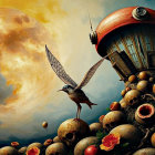 A surreal landscape features a whimsical house atop a mound of skulls and spheres, with a soaring bird and floating hot air balloons amidst vibrant skies and clouds. A dreamlike, eerie scene.