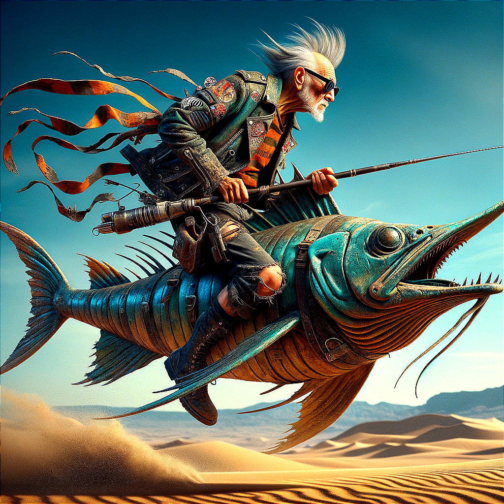 An elderly, stylish punk riding a large, mechanized fish over a desert dune, with red flags fluttering in the wind.