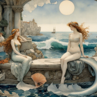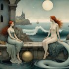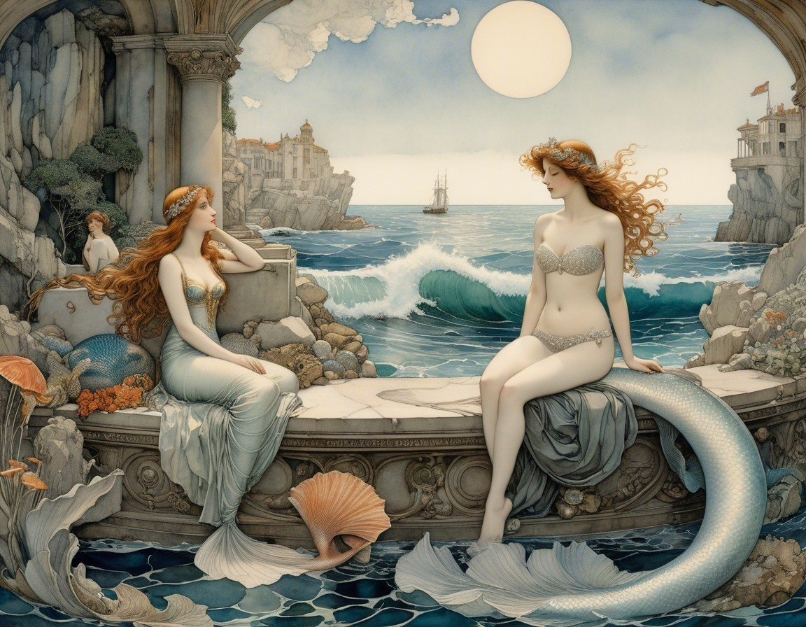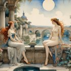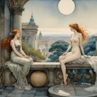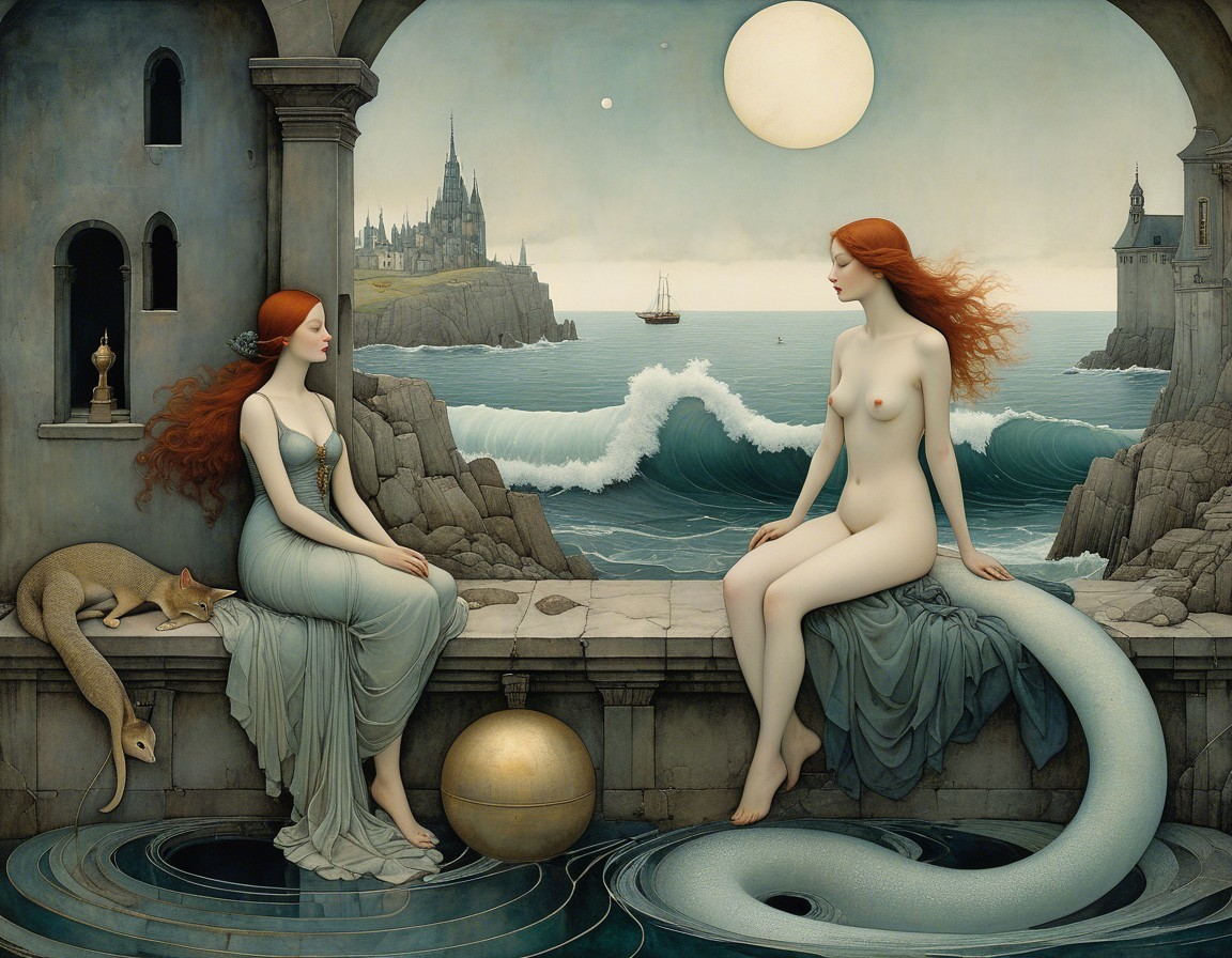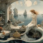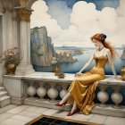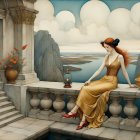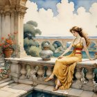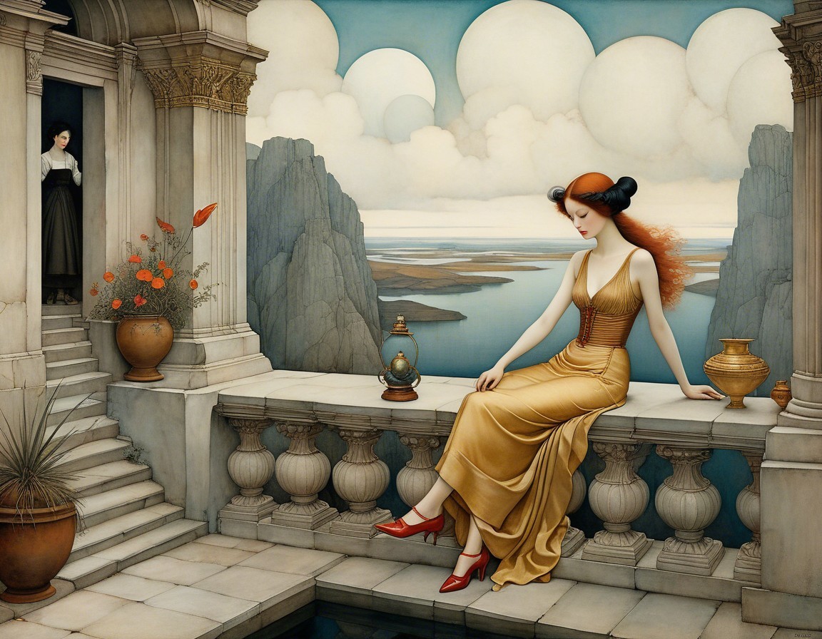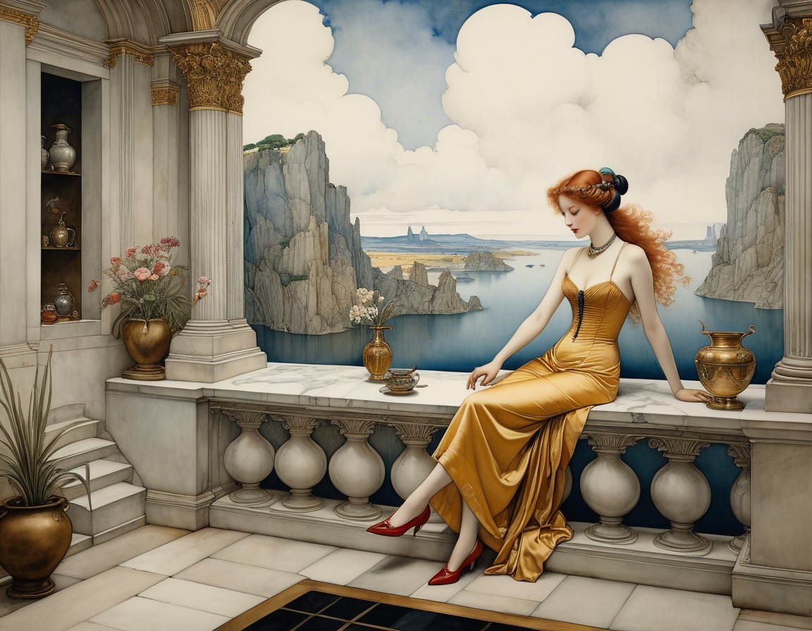 A woman in an elegant orange gown sits contemplatively in a lavish room adorned with intricate paintings and ornate furnishings, reflecting a dreamy, artistic atmosphere.