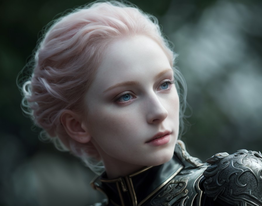 A young woman with pale pink hair and striking blue eyes gazes thoughtfully. She wears ornate armor, reflecting a blend of elegance and strength against a blurred, natural backdrop.