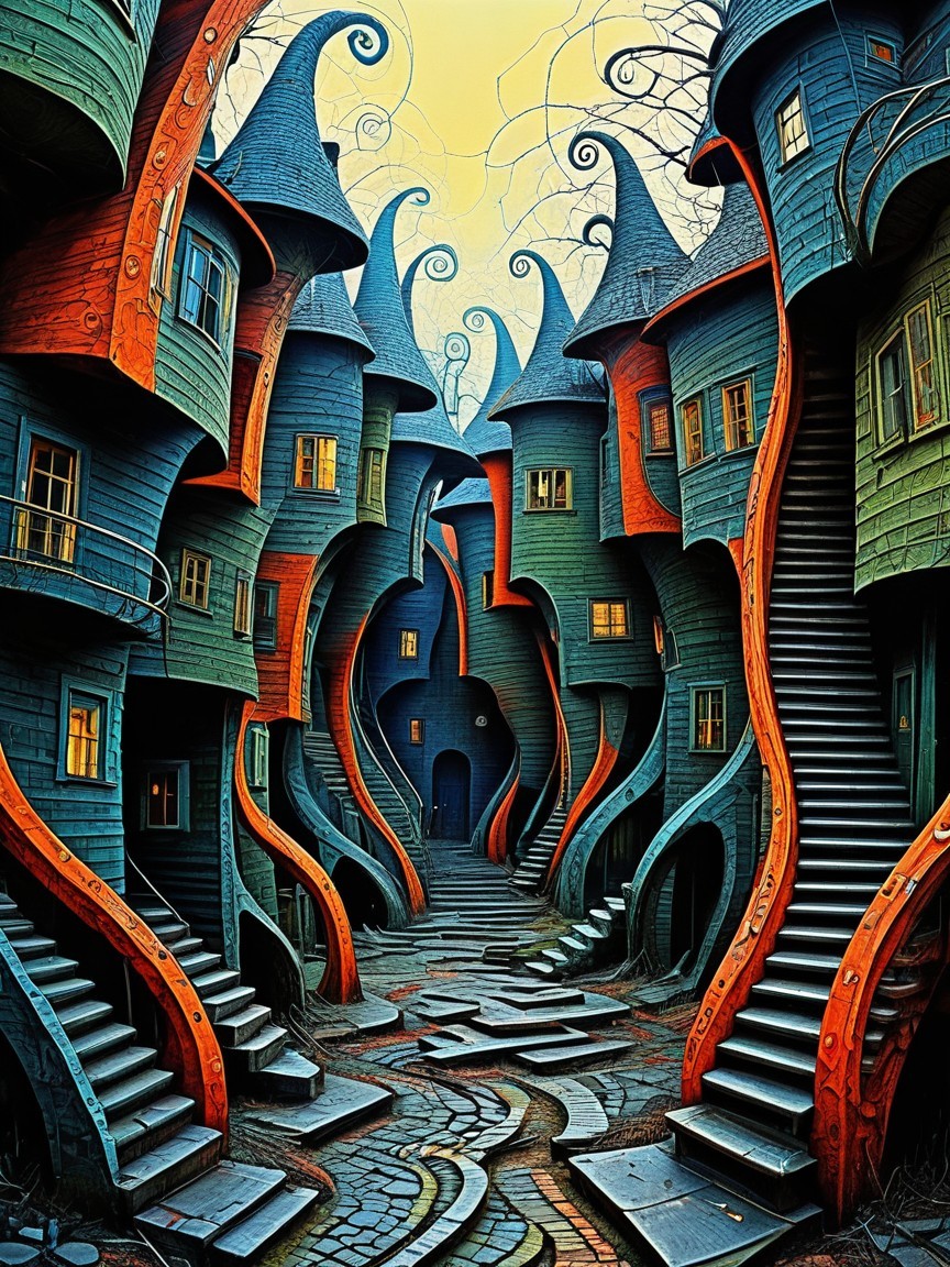 Prompt: "[ (( colorful (-) twisted whimsical surreal spatially twisting in shape village houses, extremely hostile architecture, swirl of surrealism art, by Zdzisław Beksiński, connectedness, broken buildings, twisting streets, ( h. r. giger transfer into gerald scarfe style mixed with style of Stephen Hillenburg )_lines abstract generated cracked brushstroke, R&F Pigment Stick® Techniques: covered in misty Trace Monotype Art by Stephen Hillenburg transfer into Gerald Scarfe f*cking hyper-maximalist dressed in artwork inspired by Dec Art like as: {Francisco Goya's Masterpiece by Stephen Gammell & by Endre Penovac & by Basil Gogos & Rudy Meeuwissen} : The Hauntingly Beautiful Artwork of Ryohei Hase as vector smoke art )) ]"