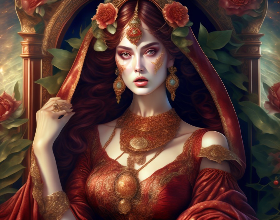 An illustrated woman with red eyes and hair, adorned in gold jewelry and rose motifs, gazes seductively in a gothic setting.