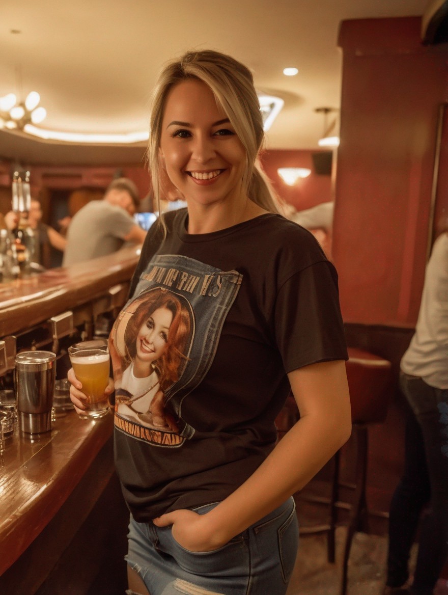 Wife at Play in the bar . Smile, concert t-shirt, old denim miniskirt made from a pair a bluejeans, net tights