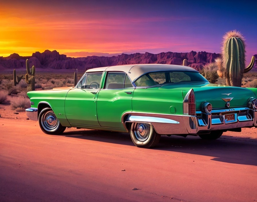 A classic teal car parked in a desert landscape at sunset with cacti and red rock formations in the background.