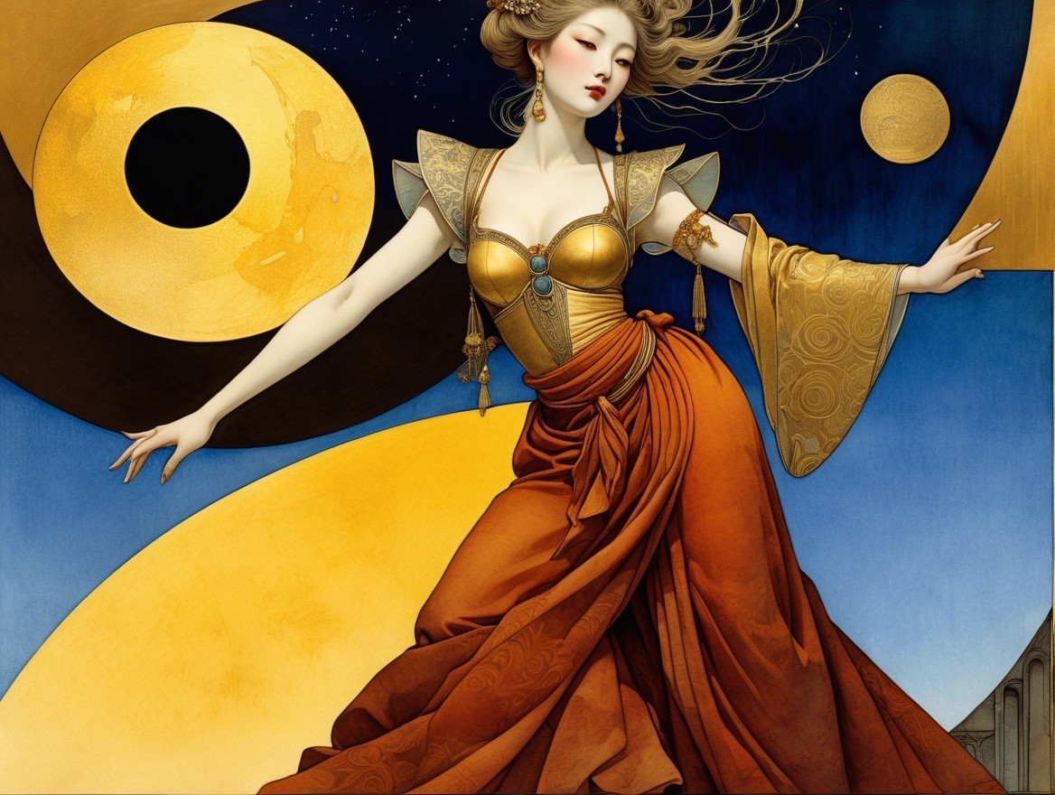 Ancient cities, ancient tales. Ancient spirits Beautiful exotic woman. in the style of Ohara Koson. Golden Ratio, Surreal Fantasy, Elegant, High Definition Ultra Fine 3D Line, Zenangle Style, Watercolor Patchwork , Arthur Rackham Style, Paul Kidby, Gediminas Prankevicius, Jacek Jerka, Extremely Detailed, Intricate, Thoughtful, HDR, Fractal, Beautiful, Award Winning, Fantasy Look, Fantasy, Crisp Quality