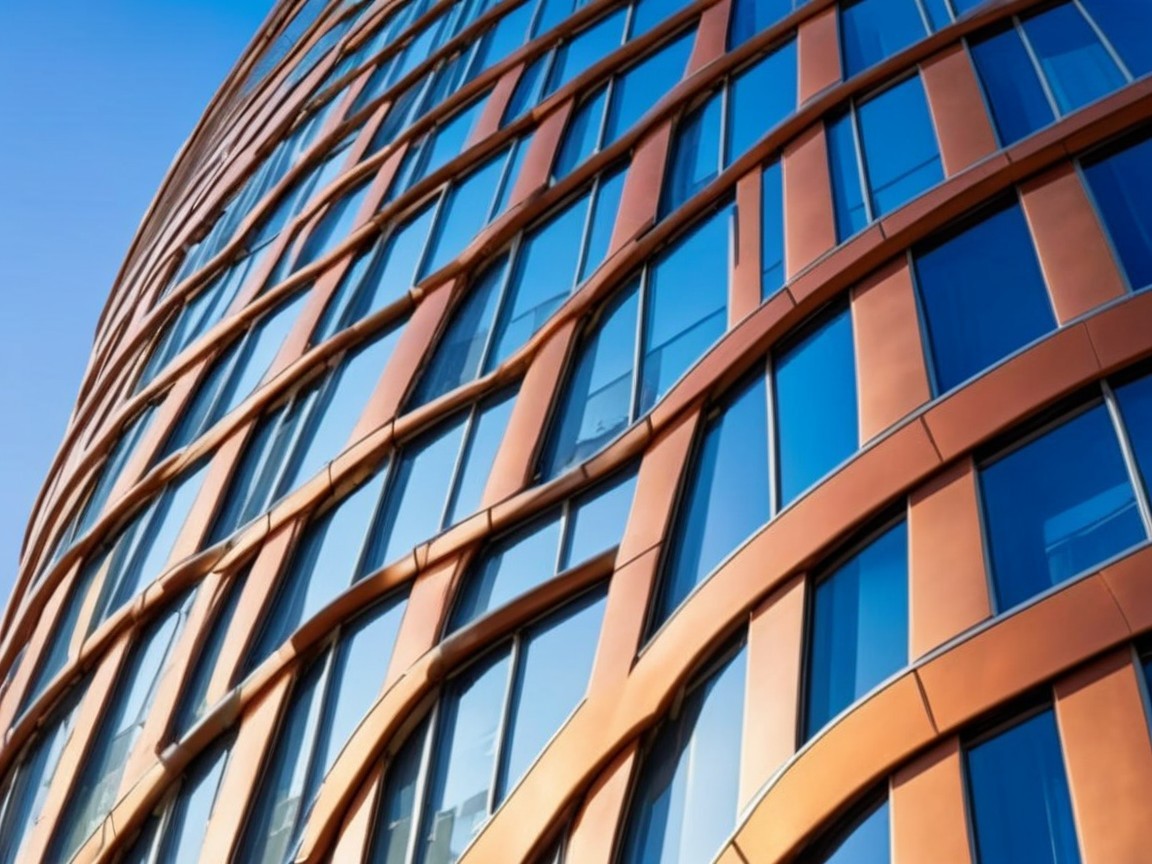 A modern skyscraper with a wavy facade rises against a bright blue sky, featuring reflective glass panels that shimmer in the sunlight, showcasing innovative architectural design.