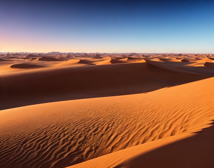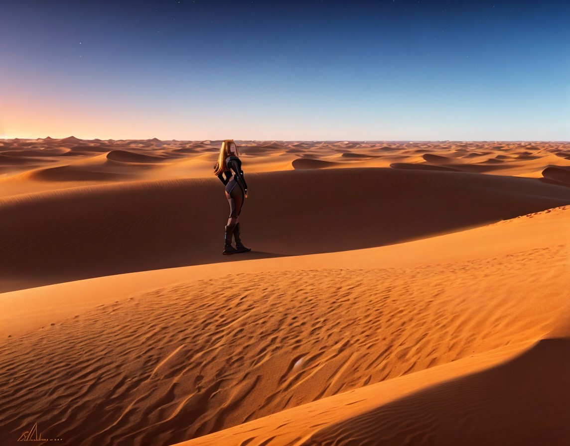Prompt: the dunes of Arrakis, a beautiful woman walking on the dunes in the distnace, wearing a technical sifi Fremen suit with cape, open hair, the suit is mostly black and sand brown