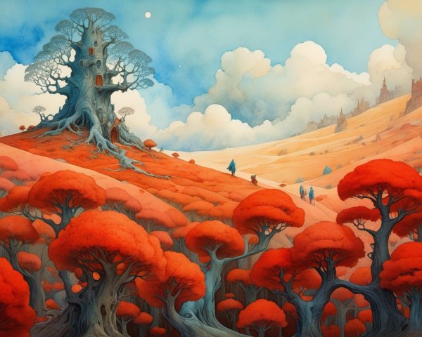 A serene woman adorned with flowers gazes amidst vibrant red poppies, under a lush tree. Bubbles float around her, creating a dreamy, mystical atmosphere in this enchanting scene.