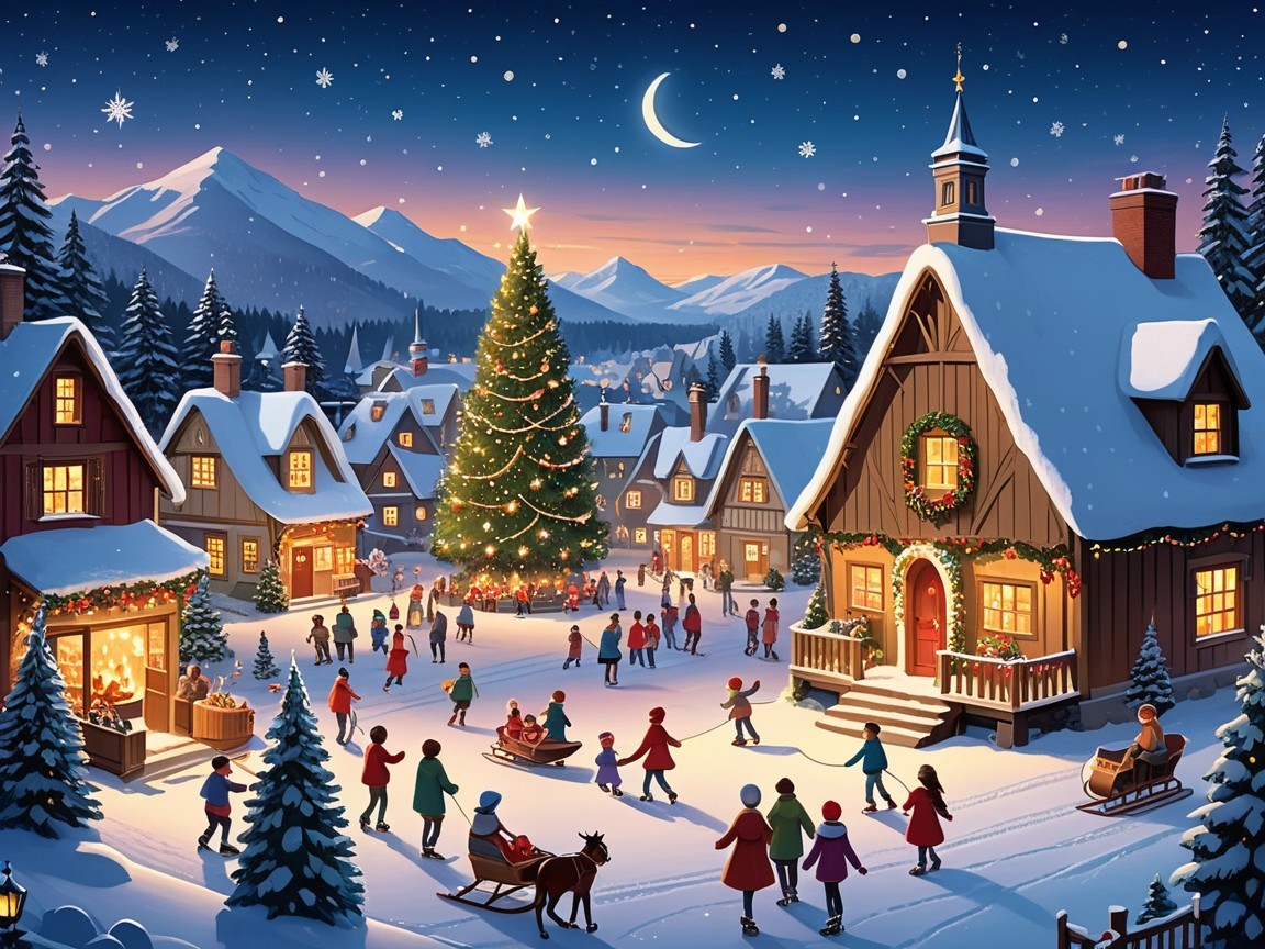 A charming winter village scene features a decorated Christmas tree, festive lights, and families enjoying the snow. Children play, while mountains rise in the background under a starry night sky.