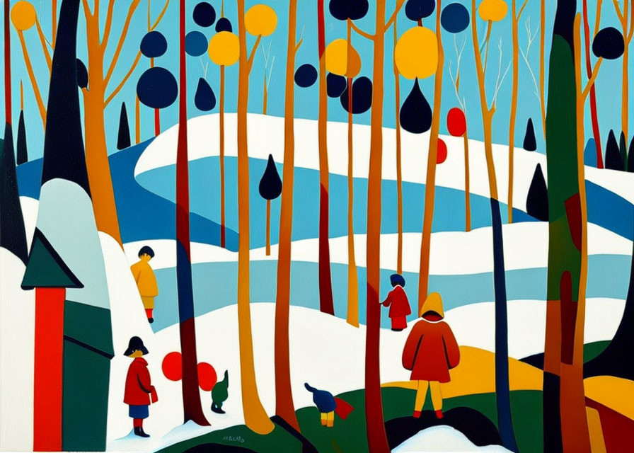 Colorful Illustration: People and Dogs in Vibrant Forest