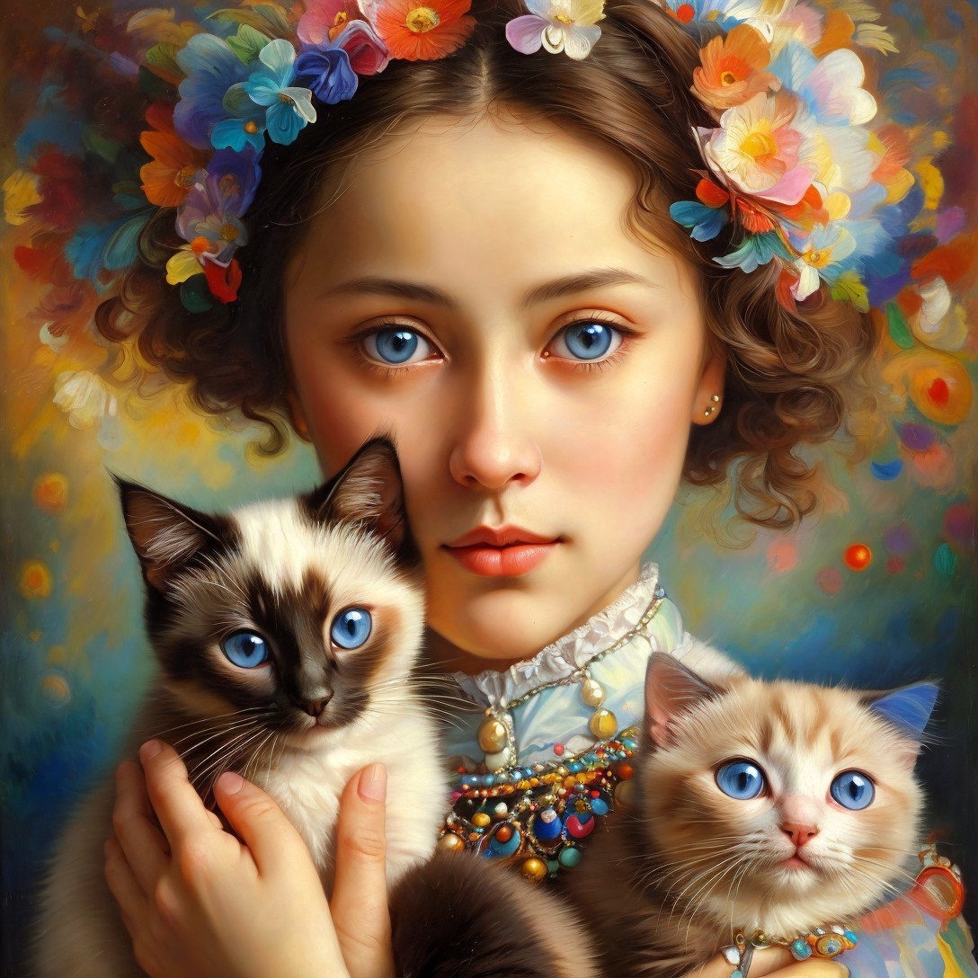 + Prompt:A portrait of a beautiful woman with big brown eyes holding a cute blue eyed Siamese kitten in her arms,. Kandinsky style, Rembrandt style background