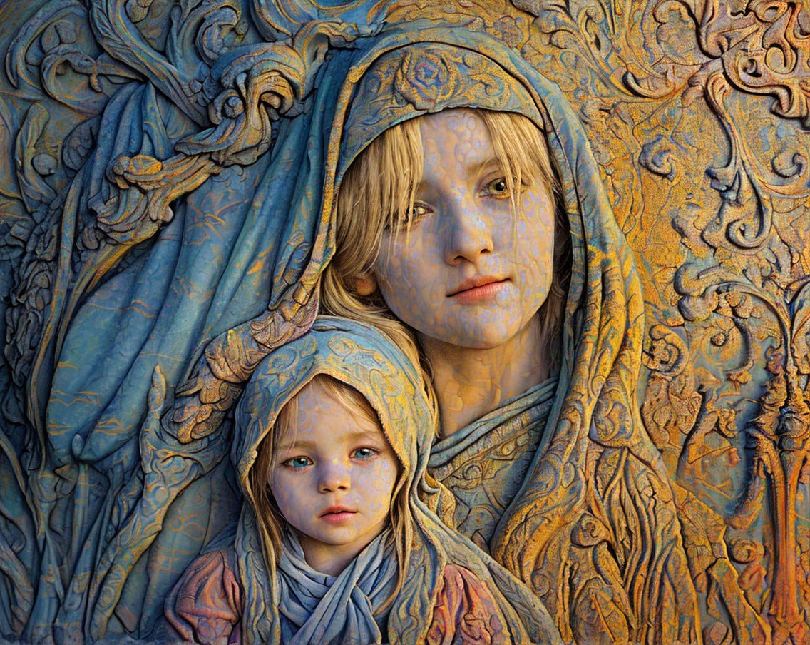 + Prompt:Vibrant stone half-relief, intricate details, colorful palette, friendly woman with blond child, flowing blue veil, serene expressions, textured stone surface, delicate carvings, religious symbolism, soft shadows, realistic lighting, artistic interpretation, high-resolution, in style of Albrecht Dürer