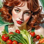 A young woman with curly hair poses closely to a vibrant salad filled with fresh greens, tomatoes, and flowers, exuding a cheerful and healthy vibe against a bright background[rom: