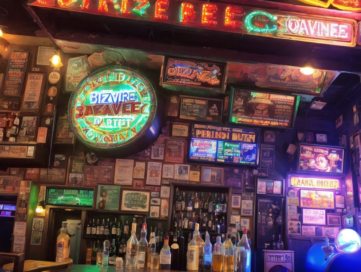 Vibrant bar with neon signs and ambient lighting